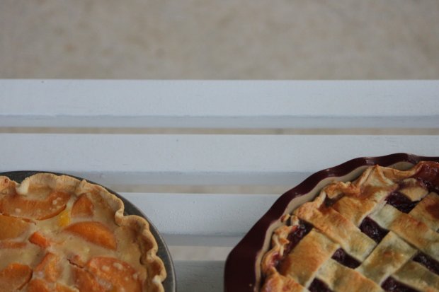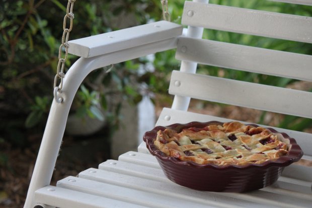 A porch swing. What’s better than a porch swing? Pie on a porch swing! My sister came up to her in-laws’ this week and somehow through the magic of text messaging and family recipes they put together a lovely spontaneous cookout. Not bad for the middle of a workweek! She made some pies, her father-in-law did some grilling and we all ate well. The cherry pie is a Southern Living recipe, and the peaches and cream pie is from Great Grandma Manges’ family cookbook. The internet is pretty great for recipe finding, but family recipe cards and books are among my personal treasures. Later I will have to say more about spaghetti squash and shrimp on the grill, but right now I’ll appreciate the coziness of a welcoming front porch.