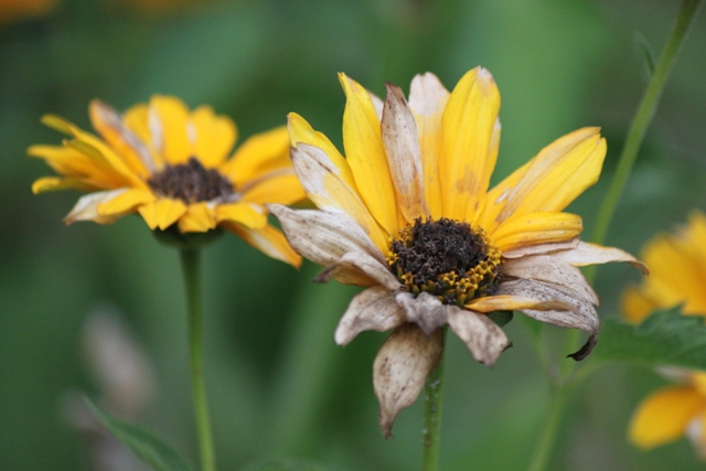 There has been extreme heat this month across the country, and without compensating rainfall or exorbitant water bills, many of the usual green-lawned neighborhoods are now brown and weedy. Tonight while a pie was baking in the oven (upcoming post!), I went outside in my mom’s flowers. I was drawn to the effects of the heat wave in the garden, like pop up Queen Anne’s Lace, dried up daisies and thirsty cone flowers. Then I thought about the thalo green grass that sometimes appears from under the snow in late winter.