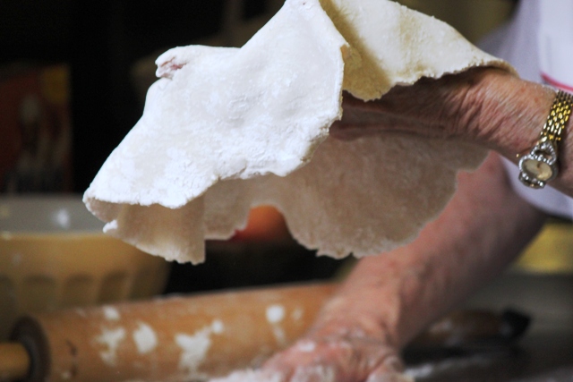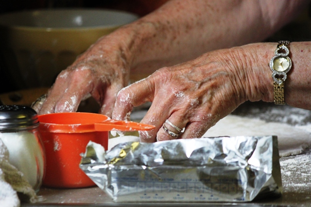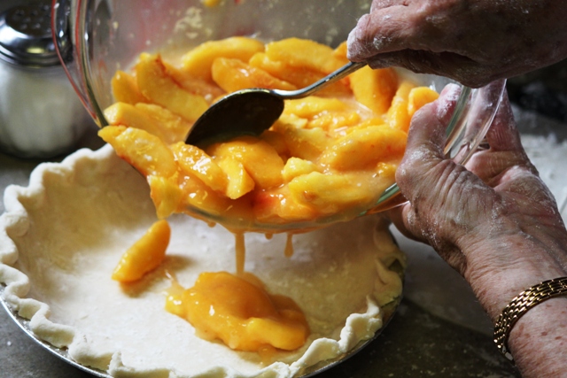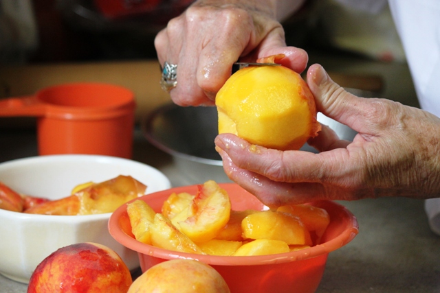 Those hands have been peeling peaches for 75 years! My grandma was one of ten brothers and sisters who grew up on a farm in Northeastern Indiana. This time of year, they would get up to seven bushels of peaches at a time, and the five girls would sit on the front porch and peel them for canning, to put up for the winter. In the summer months, my great-grandma, Margaret Beck, would do all of the baking in the morning on a cook stove. On special days, she would bake pie. She used giant pie tins and always made at least two at a time. My grandma came to stay with my mom this week, the first week for peaches in our area. I visited one day after work and spent time with her in the kitchen. That night I sat at the table with my mom and grandma and ate peach pie off of my great-grandma’s dish.