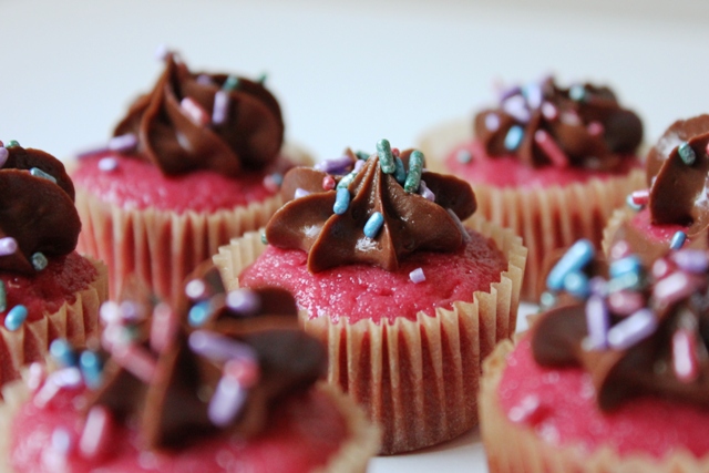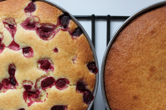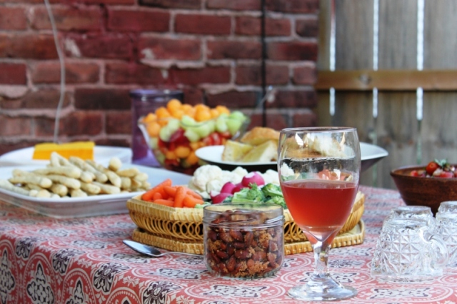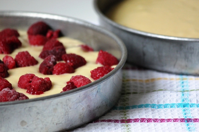 I was flattered when asked to bake a cake for my dear friend Mary’s 30th birthday back porch celebration. I asked for her top 5 ingredients, and she said, “lemon and raspberry would be on the list, possibly strawberry or coconut. Usually chocolate, but it’s so-oo hot that fruit is on the brain.” I found a hot pink raspberry cake recipe, then I was told about this lovely lemon yogurt cake recipe. Why not both? I added frozen raspberries to one of the layers of the undoubtedly light and fresh lemon cakes, and topped it with raspberry cream cheese frosting. The hot pink cake turned into mini-cupcakes with dark chocolate buttercream. The evening was filled with deliciousness (her husband makes homemade breads! and they made those nuts I can’t stop eating). The birthday girl was aglow.