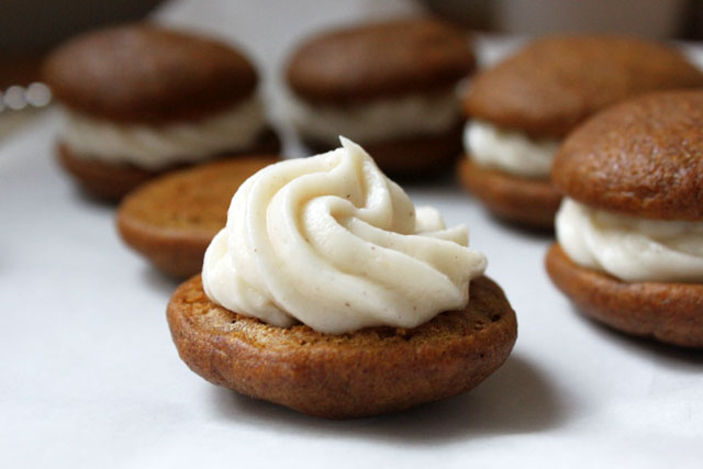 Every year pumpkin season starts for me on September 27 when, to commemorate her birthday, my mom gets out the Libby’s and puts together two pumpkin pies to share. My sister’s family came to celebrate this weekend, so I hunted down my pumpkin whoopie pie recipe to make for our get together. I changed up the original recipe from Baked: New Frontiers in Baking a bit with some bourbon, olive oil, allspice and extra cinnamon. The result was a less vanillan, more splendorous barrel spice pumpkin cake, sandwiching the lustrous cinnamon cream cheese sweetness. Looking forward to pie with Mom on Tuesday. Happy Fall!