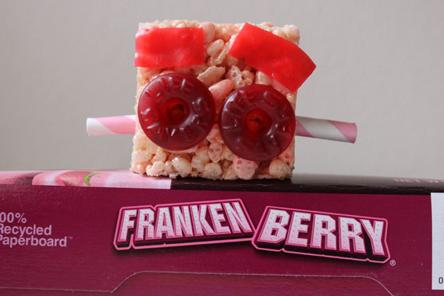 I have had Frankenberry on the brain since I decided to put together a friendly strawberry cereal monster costume this year. One time I made Booberry cupcakes for Halloween, but when I saw the strawberry marshmallow sale at Kroger, I was inspired to make Frankenberry Rice Krispie treats. I stuck wild berry Life Savers gummies on with icing for the geary eyes and cut out some strawberry Fruit Roll-ups for the eyebrows. Crunchy and chewy pink monster! I can’t wait to wear my pink hair… this Frankenberry will be a little more pixie ladylike, I think.