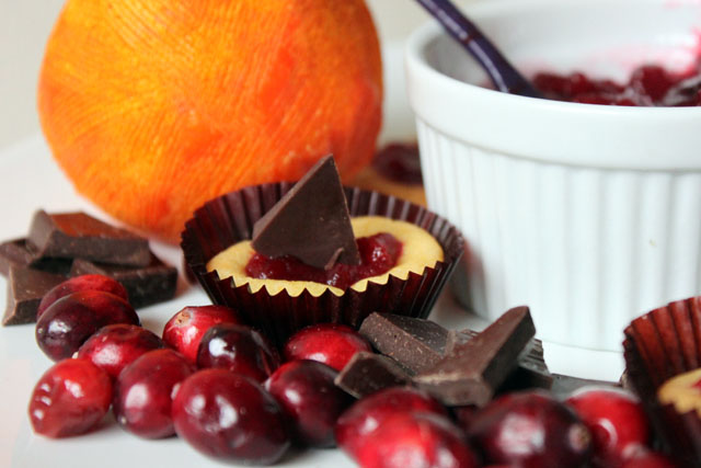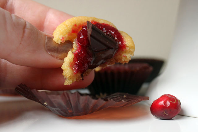 I made fresh cranberry orange sauce this year for Thanksgiving. Though I can eat it by the spoonful, it is no surprise it was the lone leftover of the weekend. Not everyone goes for jiggly, tart, citrusy substances. Today I added the zest of one orange to a little extra sugar cookie dough from a project I was working on in hopes of making a version of jam thumbprints with the leftover sauce. (I soon discovered that there is a reason for the difference in the dough of sugar cookies and thumbprint cookies) the cookies basically flattened out, so I decided to put two dough balls in a mini cupcake paper (sort of looked like these “mallow butts” from one of my favorite sites) and bake away. It worked better, and I made a well in the cookie cup for the cranberry sauce and topped it off with a shard of dark chocolate. These cran-orange cookie cups with chocolate may convert a few to the cranberry side. What’s a leftover?