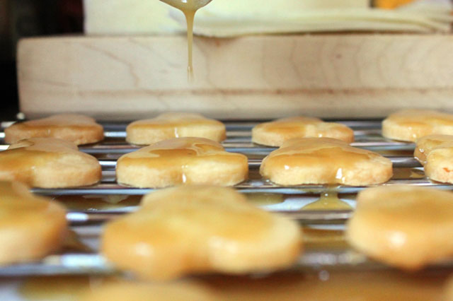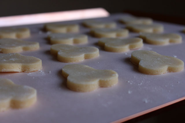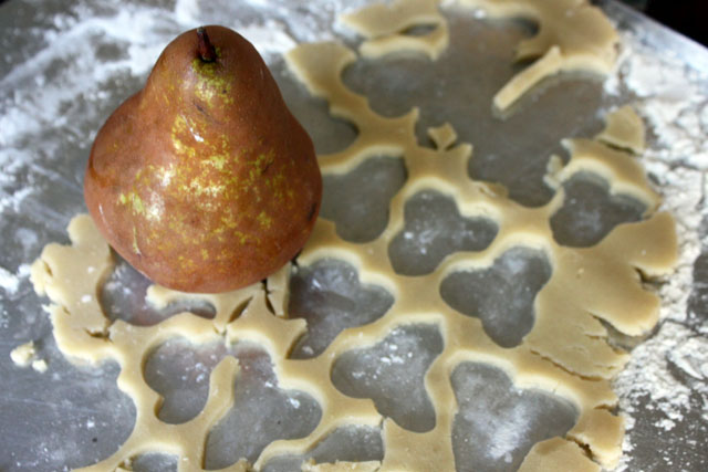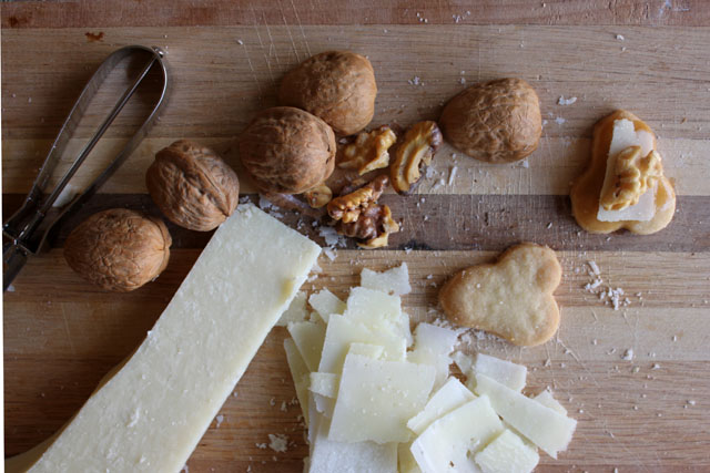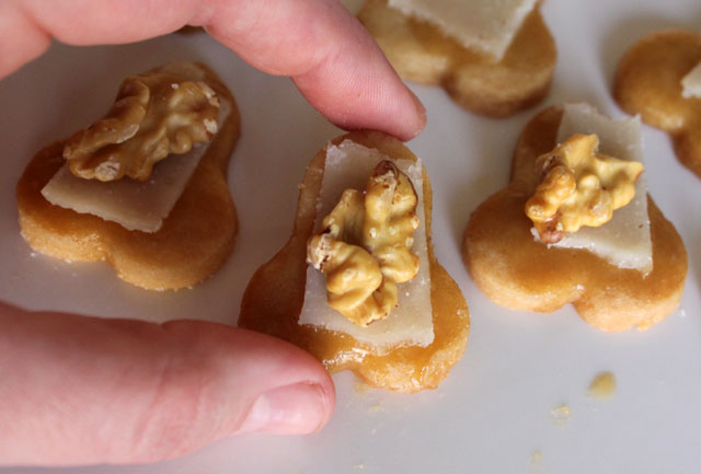 An inspiration storm hit when I opened a package that came in the mail for me last week. A friend, who knows a thing or two about treasures, sent me this tin of cutters that she uncovered at a thrift store! I gave them each a bath and decided to start out with a classic shortbread recipe. Since I was using the pear shape, I made a pear glaze to coat the shortbread. To cut the sweetness, I added shaved slices of the salty Italian sheep’s milk cheese and topped it off with a toasted walnut. Flavor boomerangs! I will make these again with other fruit, cheese and nut combos. Fun little pick up snacks made with a super pick-me-up gift.