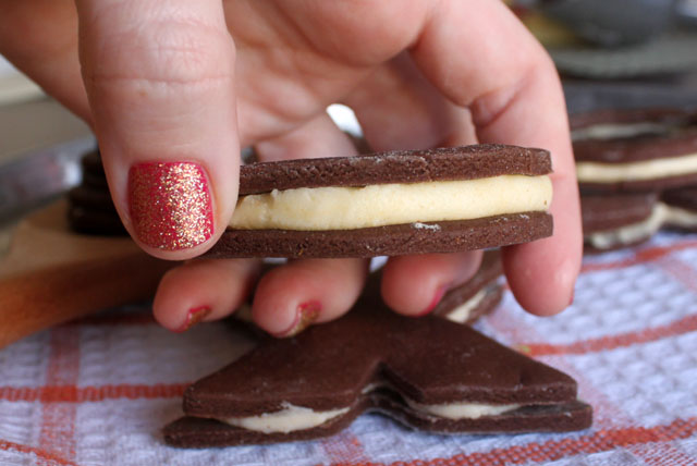 I think Indian food is a nice choice for Valentine’s. Inspired by that idea, and a trip to the local Indian food grocer (that actually had Bird’s Custard Powder on the shelf!) I put together this sandwich cookie. It’s a mash-up of recipes from Aarti Sequeira and Nigella Lawson. Custard Cream-Filled (link to recipe) Garam Masala-Chocolate Gingerbread (link to recipe) Sandwiches. Long name, lots of flavors and textures. All squeezed together in one smooth, rich and spicy cookie sandwich. xoxo, Amy
