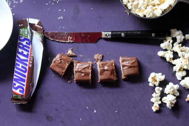 You know surprise cupcakes; the ones where you bite down and find there’s more than just cake in there? I actually never make them myself (my sister does them so nicely with the chocolate cake, cream cheese, and chocolate chips), but I have been tasting out different popcorn ball recipes, and I thought, “these balls could stand a surprise inside.” Chocolate was my initial instict, but chocolate alone seemed much too boring. Something with extra gooeyness and more flavor dynamics… a Snickers, YES. If you eat one of these surprise balls within an hour of assembly, the chocolate is still melty. It’s like you have this great ballgame or movie snack compacted into one efficient junk food treat: mallow, popcorn, peanuts, nougat and caramel, all in the palm of your hand.