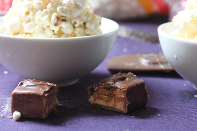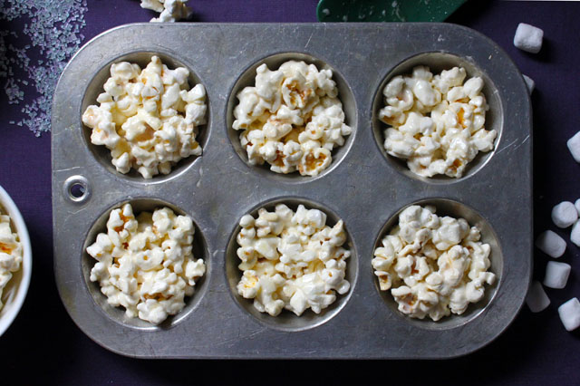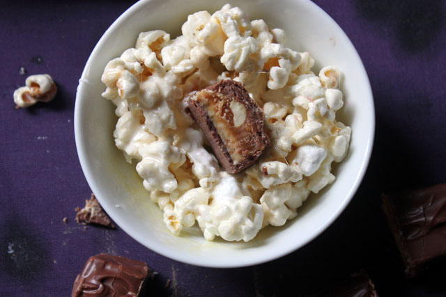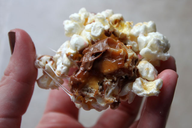 I made the less-traditional version of popcorn balls with marshmallows and butter. They are much simpler to make, softer, and there is extra “molding” time in which you can properly stow and hide the Snickers surprise.