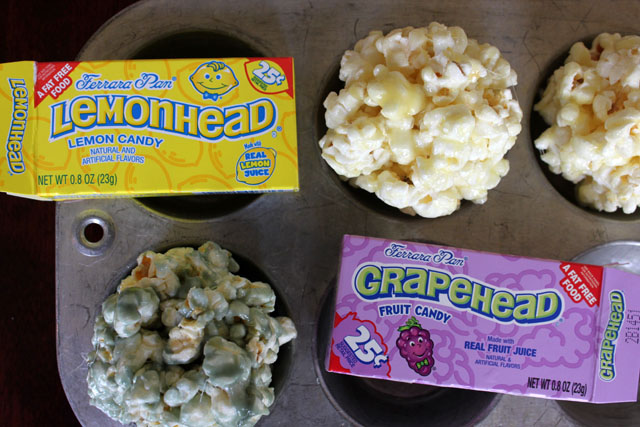 While my sister and her family were in town this weekend, we held a Grapehead Popcorn Ball vs. Lemonhead Popcorn Ball contest. Even though one lost, they were both sour. Lemon won by a slightly sweet head, though my sister maintains that grape is her favorite.