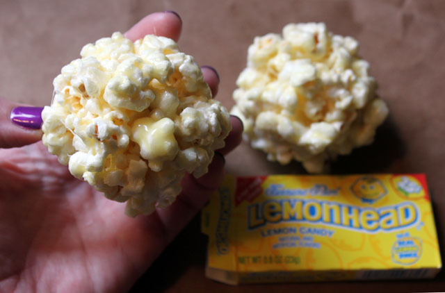 Make the sweet and tart popcorn balls yourself: Over medium heat, melt together 3 T butter, 1 C mini marshmallows, one small box lemonheads (be patient, the lemonheads will dissolve). Mix in 4 C popped corn until well coated. With oiled or buttery hands, form into balls. Makes six small orbs.
