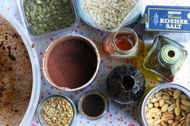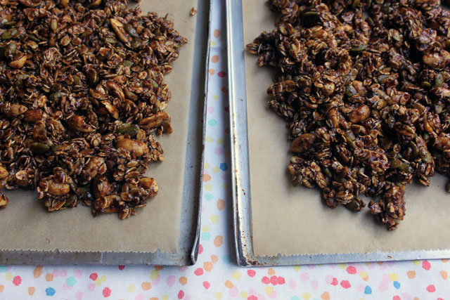 Mix everything together very well in a large mixing bowl (sometimes clean hands are the best and easiest tools for thorough mixing here). Half the mixture and spread in two baking tins (I had cookie sheets and lined them with parchment) and bake for 40 minutes, turning over half-way through baking. Allow to cool, break apart, and store in an airtight container.