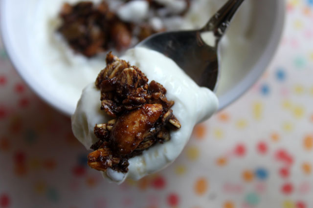 Inspired by the Domestic Goddess herself, I modified this tasty crunchy snack. Goal: make in-taking more magnesium most enjoyable. Like Nigella says, the most difficult part of making granola is actually assembling the pantry ingredients (her granola recipes also appear in one of my favorite cookbooks, Feast). Almost every ingredient in my modified recipe is high in magnesium, and bonus points when added to yogurt, whole or soy milk. P.S. Also easily Vegan-friendly