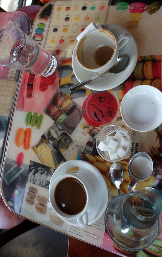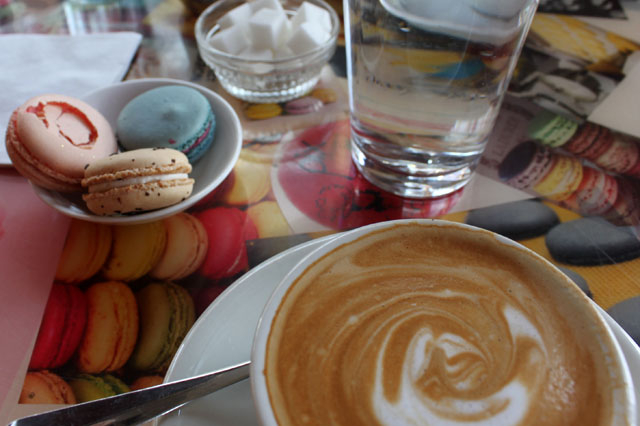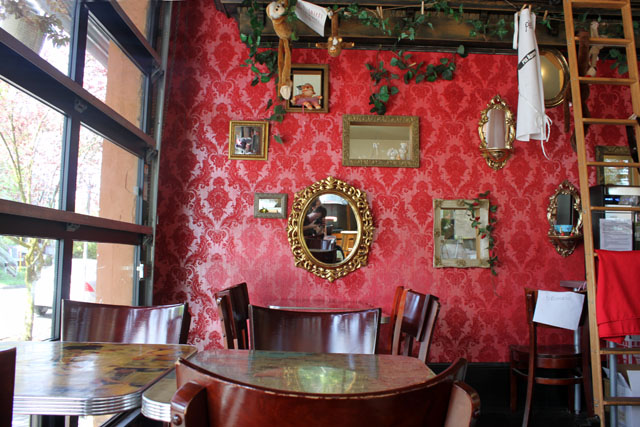 During my visit to Portland there were many cherries on top of the sweet sundae of conversation and togetherness with my cousin and her family. One such example: the luxury of a vanilla bean honey latte and fresh macaron in the morning. Sitting and talking in the sunlight that flooded through the garage-door windows of a cafe adorned with flocked red wallpaper, Belgian beer, jewel-toned chocolates and stuffed monkeys, my world was enlightened, comforted, and caffeinated at Pix Patisserie with Jenne.