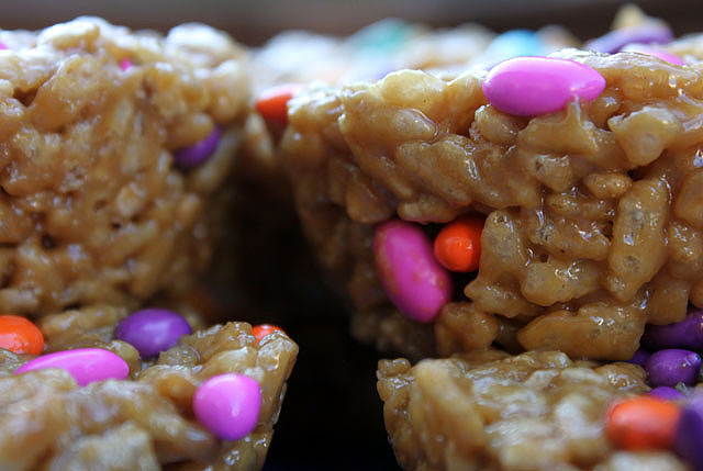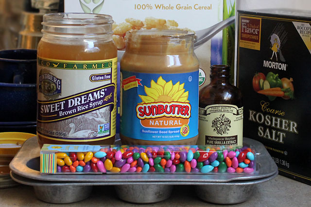 The following recipe is a combination of several allergen-free “rice crispy” recipes that are made with sunflower butter. This time I decided to mold them into cups that could be easily wrapped up in cupcake papers for individual treats. They are easier to make (if that’s possible) than traditional marshmallow crispies, vegan-friendly, and taste a bit like Scotcheroos.
