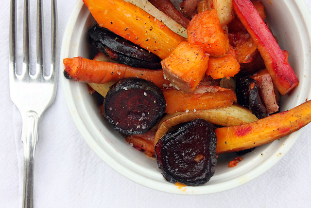 I unloaded my farmers market basket of root vegetables and realized that they made up a loose analogous color scheme: parsnips, beets, carrots, and sweet potatoes! I liked them all together so much that I decided they should simply be roasted together. Tossed up with olive oil, salt, and pepper in a 425-degree oven for about 30-40 minutes (longer for thicker), they ensued sweet folksy nourishment.