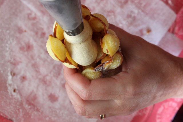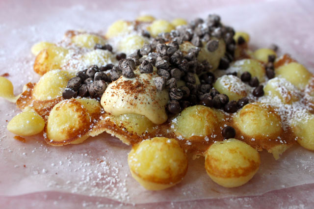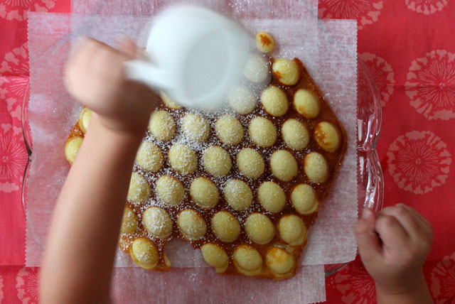 I love the idea of eating a waffle on the street. Earlier this year when my sister got an eggette pan from her husband, I learned that egg waffles are traditionally served on the street in Hong Kong! We like to enjoy them around the dinner table here, pulling the little circles apart and piecing at the sweet custardy bread with friends and family. My niece calls them Octopus Waffles and likes them with powdered sugar; I call them Bubble Wrap Waffles and like them with cinnamon sugar; my sister usually makes the waffles and likes hers with whipped cream and berries. This day we three got in the kitchen and made a rich cannoli and falltime inspired egg waffle. The recipe is from the egg waffle pan, and the pumpkin spice cream filling recipe below is adapted from a JELL-O advertisement I once tore out of a magazine. Sprinkled with chocolate chips and wrapped up, it’s a breakfast dessert that’s good on the go!