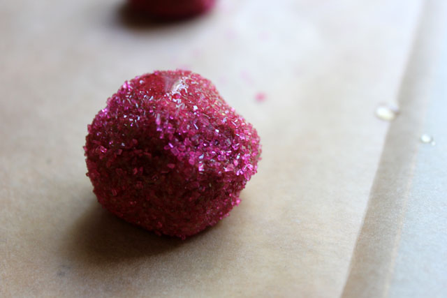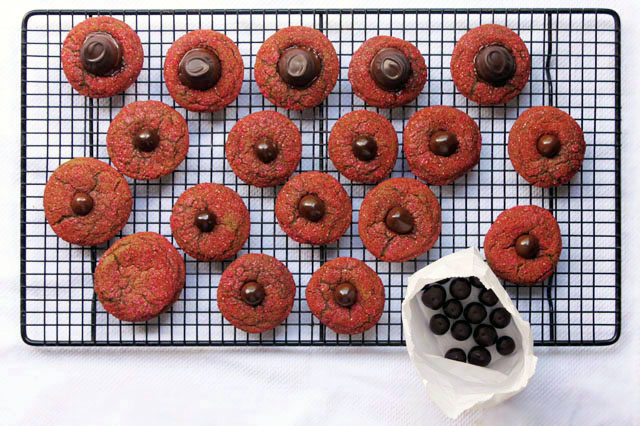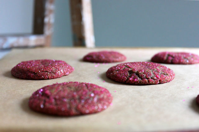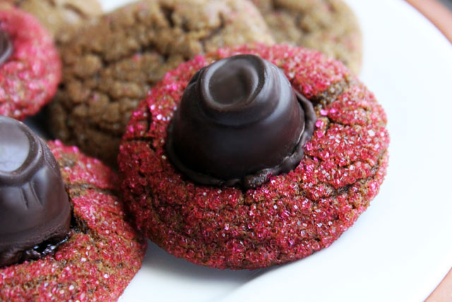 I originally posted my Great Aunt Velma’s molasses cookie recipe* when I made molasses cookies with black cherry gelato earlier this year. For this test run, I rolled the spicy dough in pink sugar (~32 cookies when you make the dough balls tablespoon size) and placed dark chocolate cherry cordials and blackberry brandy cordials in the middles as soon as they were done baking (~8 minutes in the oven). The cherry cordials have a definite ooze effect, so it may be appropriate to take a generous bite to save the spiked juices from flowing down your shirt as you crack the chocolate shell. But who said a messy surprise is such a bad thing?