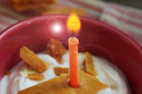 Next time I will add walnuts or almonds to the honey candy, as it is a perfect mix for encasing extra goodies. In part of this batch I set up candles in the brittle and broke them apart to make edible candle holders for plopping atop a honey lemon cake later this week (I will be 32!). The honeycomb brittle was also a fun and sweet crunchy accompaniment to a mug of creamy Greek yogurt the other morning. There’s nothing wrong with pre-celebrating, is there?