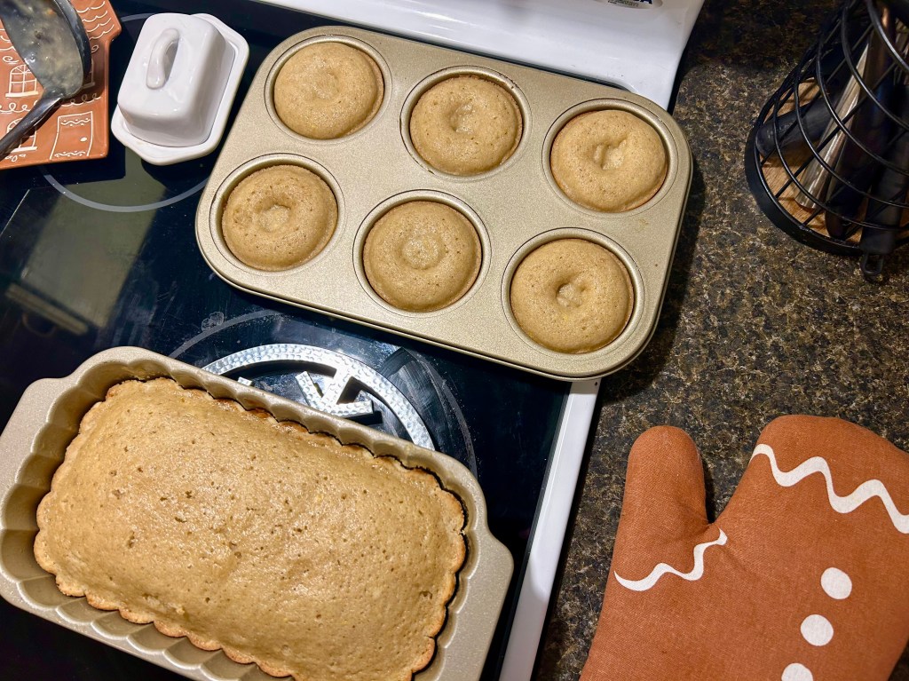 Bake, rotating the pan halfway through, until a tester inserted in the center comes out clean. Bundt pan: 45 minutes. Loaf pan: 25 minutes. Donut pan: 10 minutes.